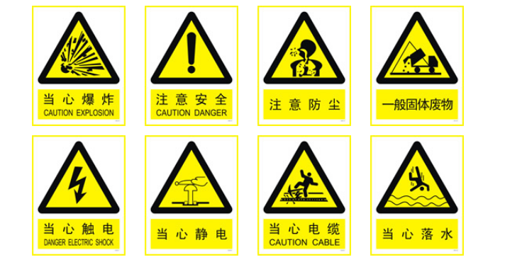 以上圖片共計包含8個標志牌效果圖,分別為:當心爆炸;注意安全;注意防塵;一般固體廢物;當心觸電;當心靜電;當心電纜;當心落水。